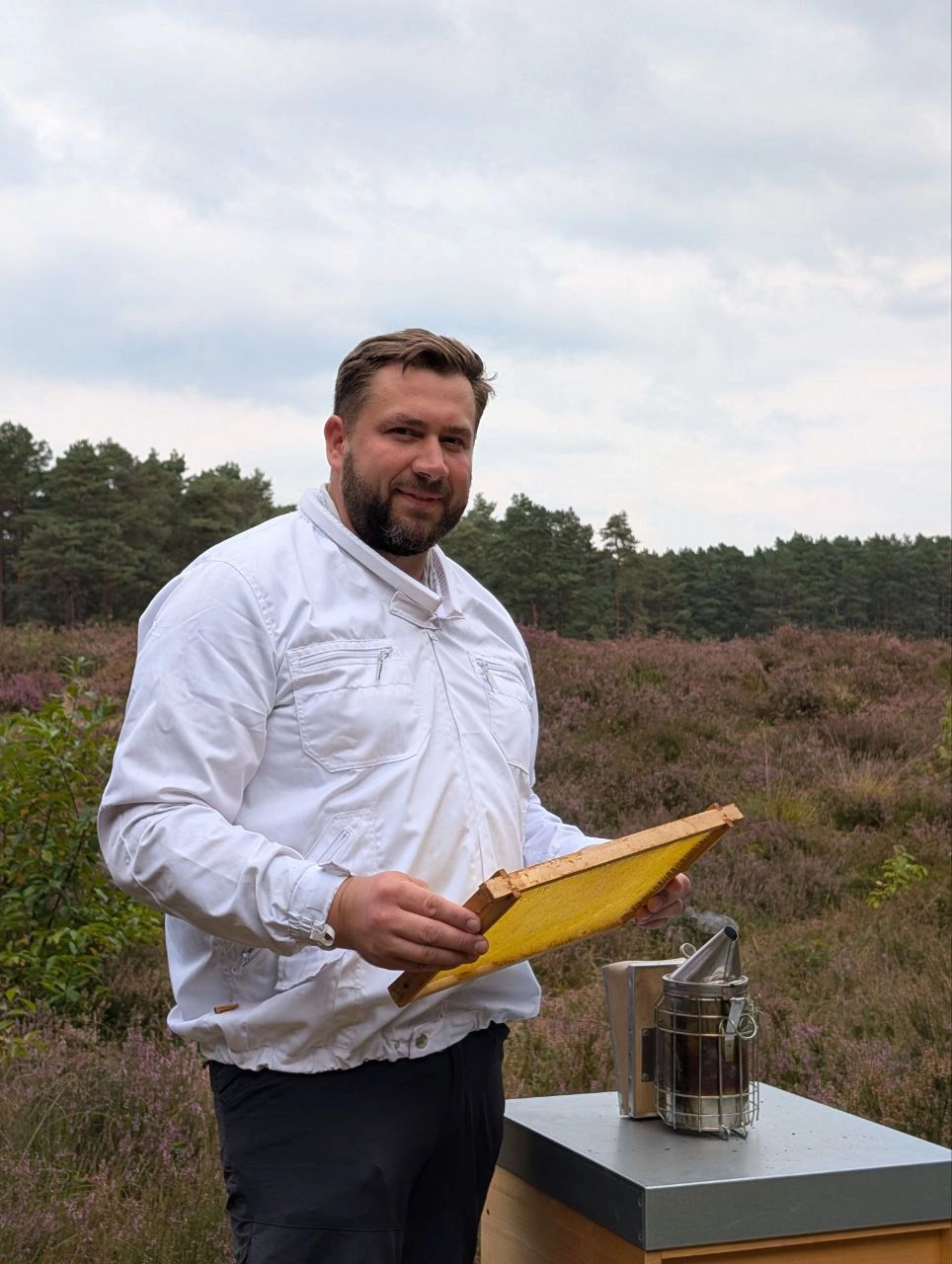 Arthur stellt seine Arbeit am Bieneninstitut Celle vor: 600 Voelker, Forschung, Honiggewinnung und Ausbildung fuer die Imkerei.